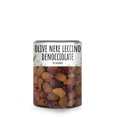 Descrizione: Olive di piccole dimensioni denocciolate in salamoia, qualità Leccino, colore tra il verde scuro ed il viola scuro