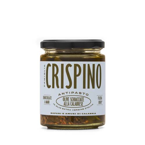 Olive verdi di piccolo calibro, schiacciate a mano e preparate seguendo un’antica ricetta calabrese. Insaporite con olio, aglio, finocchio e peperoncino. Perfette con antipasti di salumi e formaggi, sulla pizza e per la farcitura di panini.