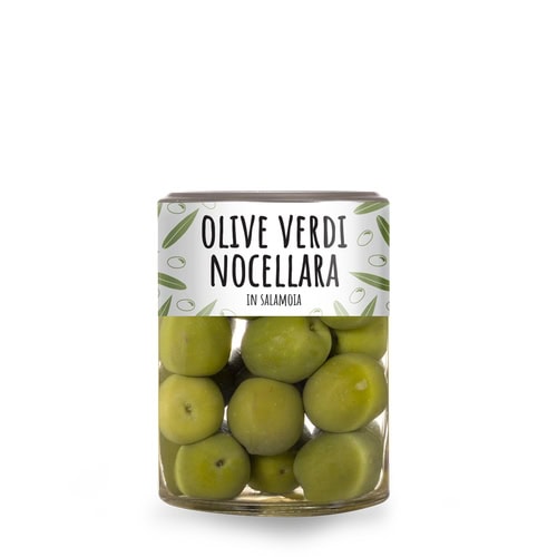Descrizione: Olive di qualità Nocellara in salamoia, dal tipico gusto dolce, di colore verde intenso, al naturale, con nocciolo.